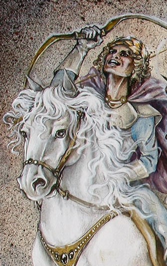 3. Vision (6:1-17): Das Lamm bricht die ersten sechs Siegel der Buchrolle. Die vier Apokalyptischen Reiter ziehen aus, die als Märtyrer gestorbenen Sklaven Gottes empfangen weiße Gewänder, und ein gewaltiges Erdbeben geschieht.